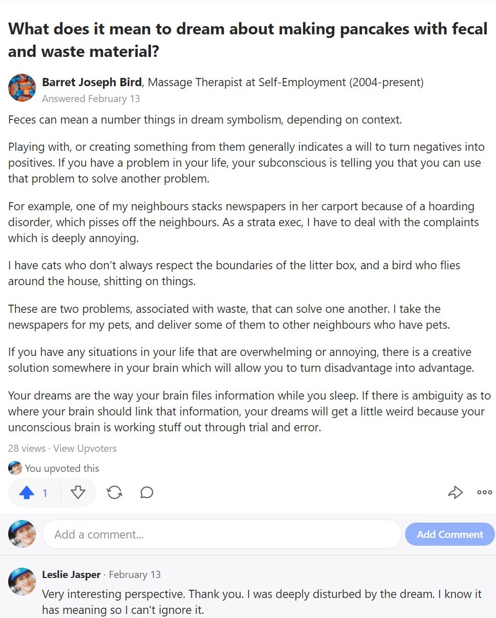 I just released a video where I shared "My GROSS Pancake Dream" video on YouTube. After having the dream, I reached out and posed the question on Quora to invite dream interpretation. The responses ran the gamut with the quality, theme, humor, or lack thereof. I am posting the full responses on here so that you may read in their entirety. As always, feedback is welcomed. I found them to be very humorous and some savage in nature. Some responses were rather actual serious with the delivery. I appreciated the insight with the wide range of feedback.